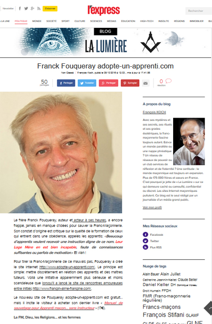 Pour tirer la Franc-Maçonnerie de ce mauvais pas, Fouqueray a créé le site internet http://www.adopte-un-apprenti.com/. Le principe est simple: mettre discrètement en relation des apprentis et des maîtres tuteurs. Voilà une initiative apparemment plus sérieuse et moins scandaleuse que lorsqu’il a lancé le site de rencontres amoureuses entre initiés http://www.frangin-aime-frangine.com/.